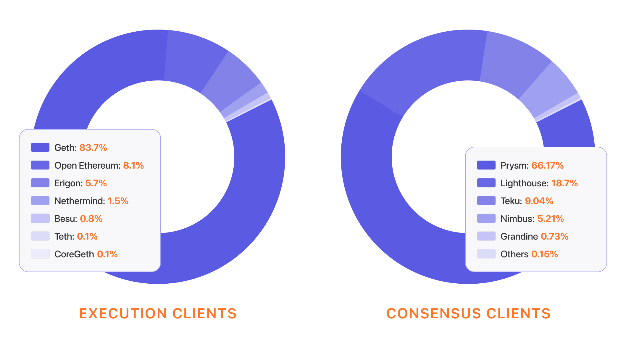 The execution layer data were obtained from Ethernodes on 23-Jan-2022. Data for consensus clients was obtained from Michael Sproul. Consensus client data is more difficult to obtain because the consensus layer clients do not always have unambiguous traces that can be used to identify them. The data was generated using a classification algorithm that sometimes confuses some of the minority clients (see here for more details). In the diagram above, these ambiguous classifications are treated with an either/or label (e.g. Nimbus/Teku). Nevertheless, it is clear that the majority of the network is running Prysm. The data is a snapshot over a fixed set of blocks (in this case Beacon blocks in slots 2048001 to 2164916) and Prysm's dominance has sometimes been higher, exceeding 68%. Despite only being snapshots, the values in the diagram provide a good general sense of the current state of client diversity.