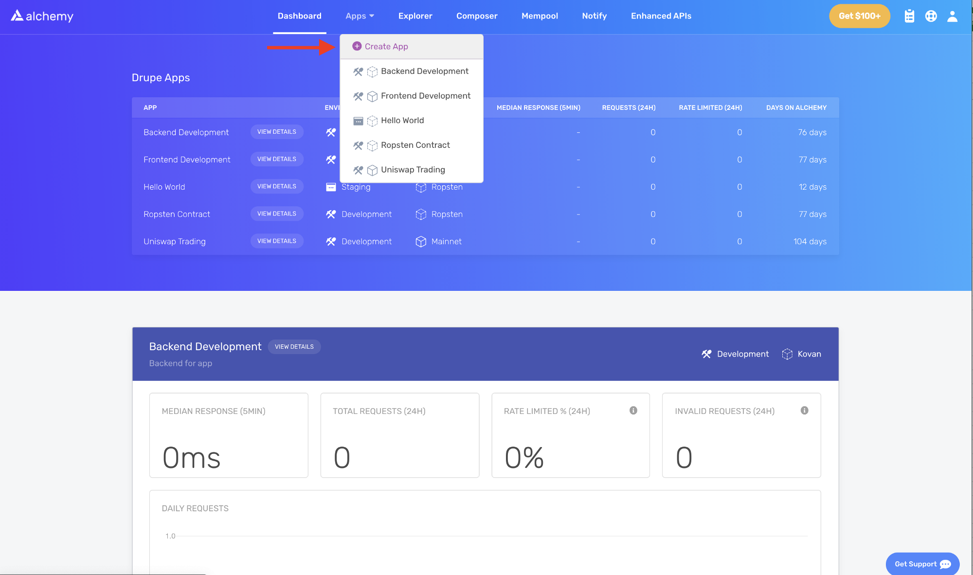 1. Navigate to the “Create App” page in your Alchemy Dashboard by hovering over “Apps” in the nav bar and clicking “Create App”
