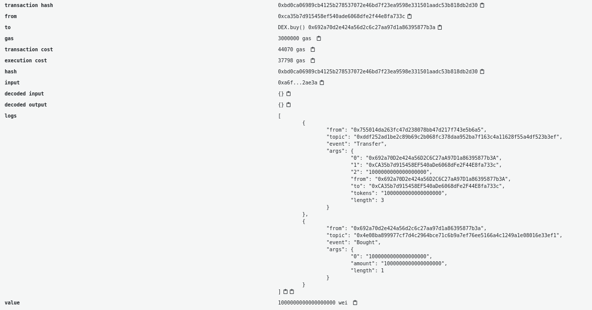 In the case where the buy is successful we should see two events in the transaction: The token Transfer and the Bought event.